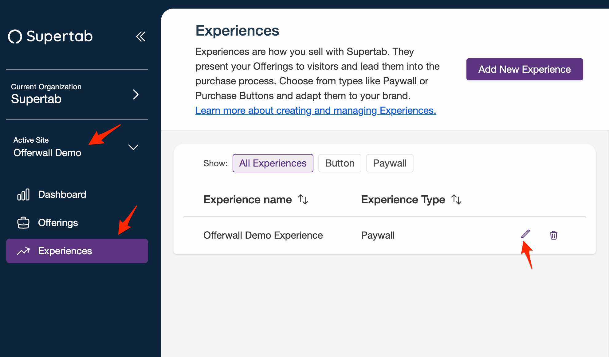 - Ensure that you have the correct site selected. Then click on "Experiences", and the pencil icon next to the experience you want to use "test mode" with.