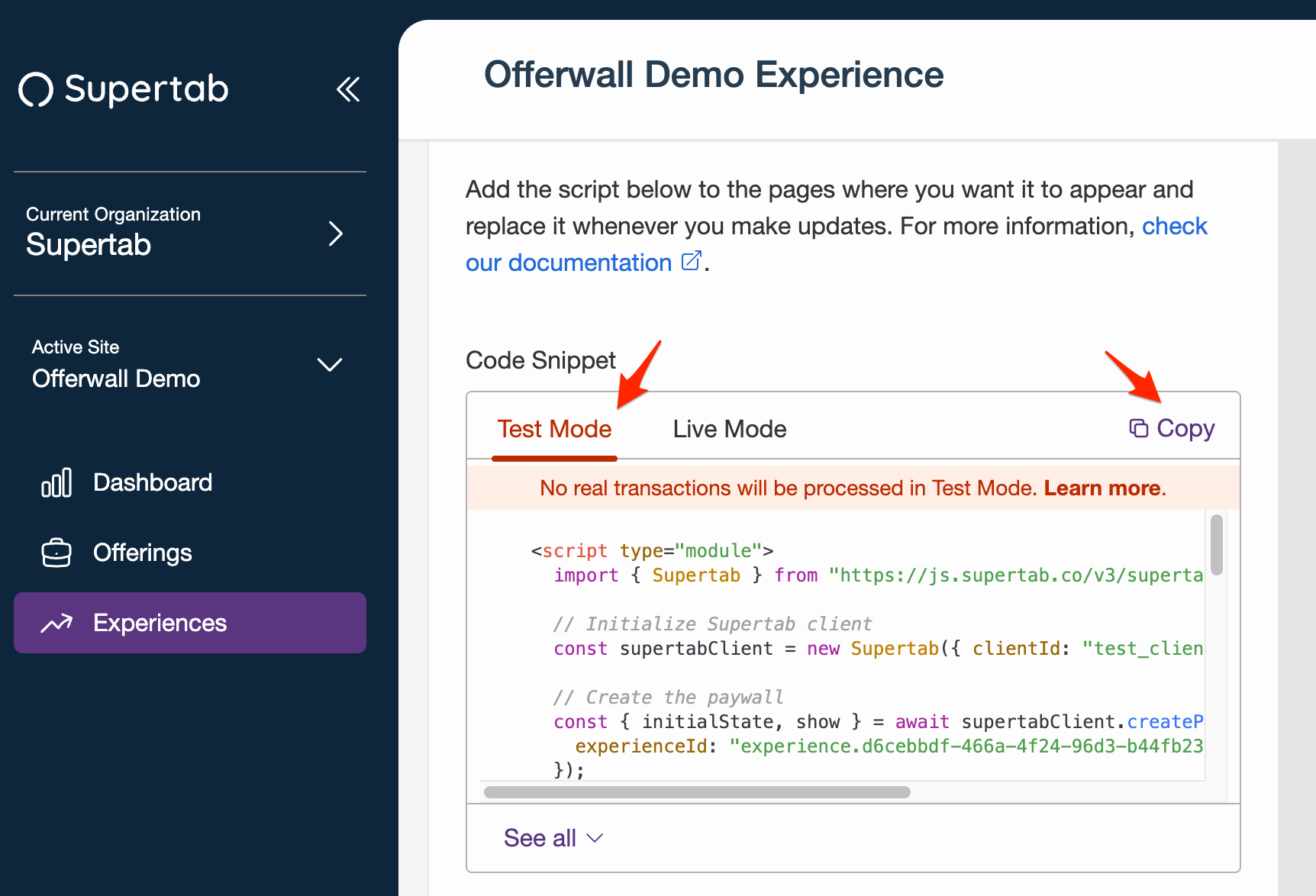 This is helpful during the integration of Supertab in your site as it allows you to test the paywall functionality (entitlements, payments, and subscriptions) without the need for exposing a real charge or credit card to your testing environment.