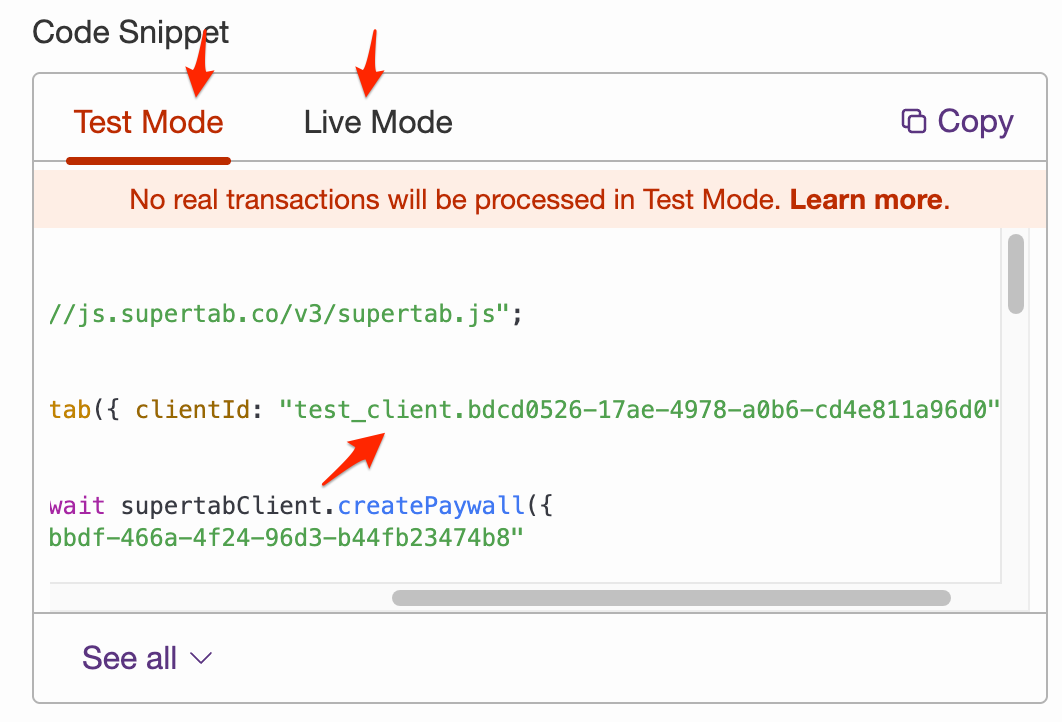 Test Mode: test_client.bdcd0526-17ae-4978-a0b6-cd4e811a96d0 Live Mode: live_client.6999fe73-78cc-4ed0-affa-17f54b60602d