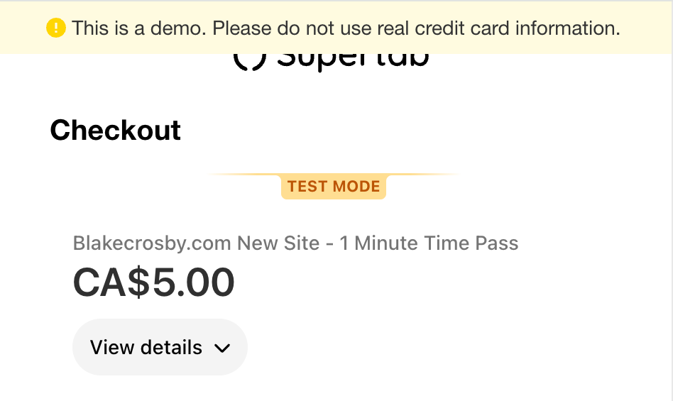 Test mode allows you to perform end to end testing of Supertab without the need to incur real charges or use real credit cards.
