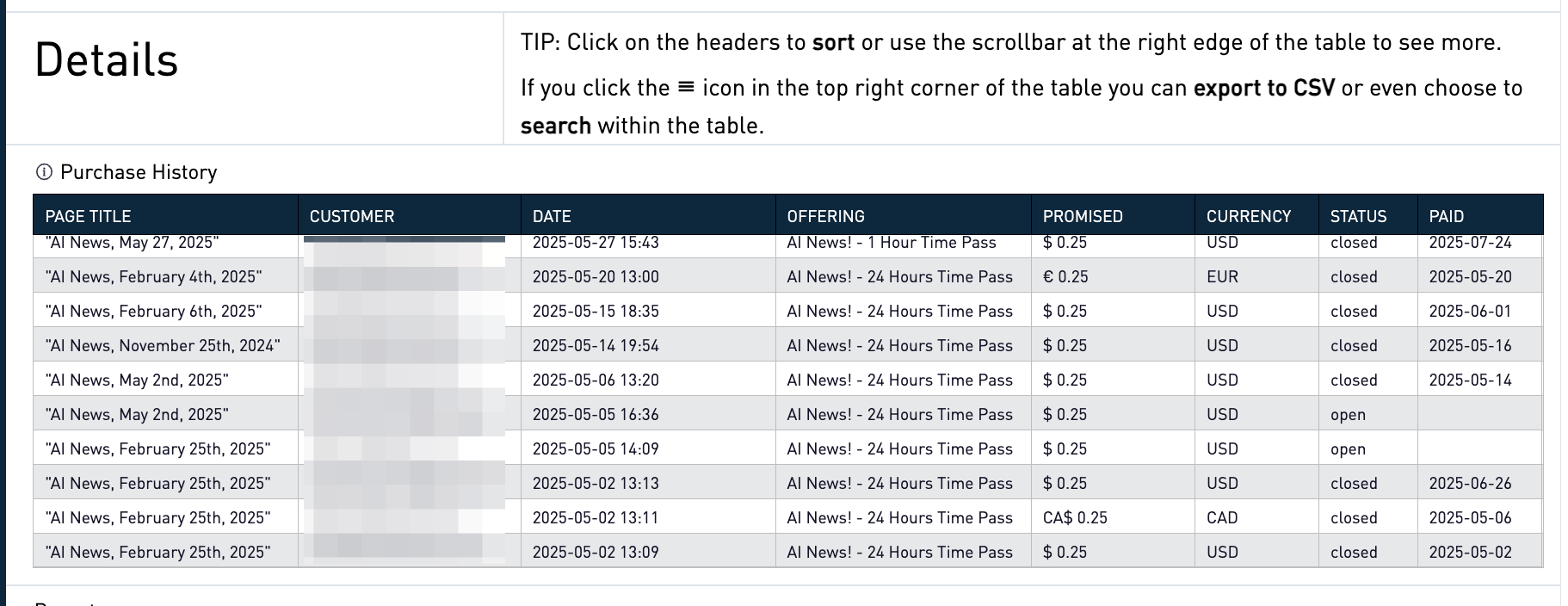 - Status: The status of the tab for this particular user. "Open" if the amount is still promised to you. "Closed" if we have collected payment for that promised amount.