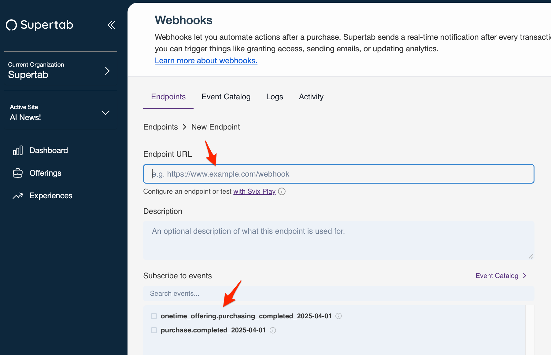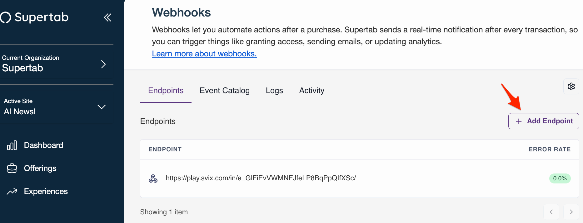 Now every time an event happens on your site with Supertab, all relevant data for that event will be sent to your webhook endpoint.
