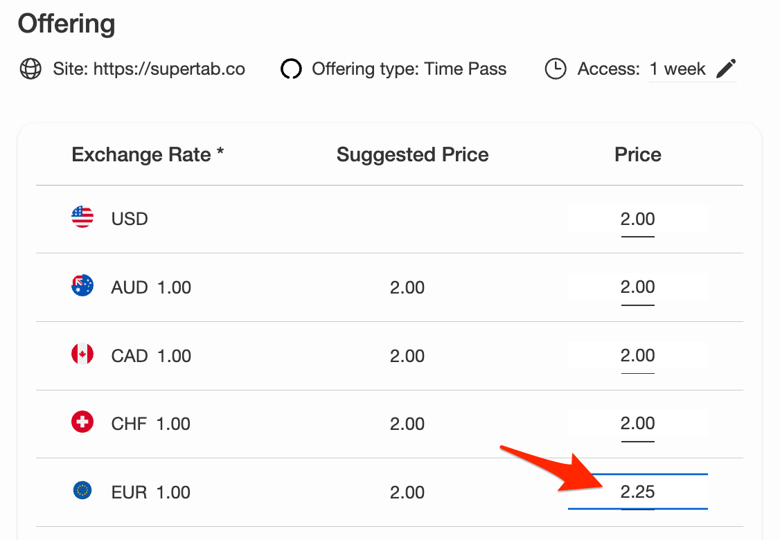 Supertab does not update your offering prices based on real time currency fluctuations. What prices you charge in which currency are always under your control.