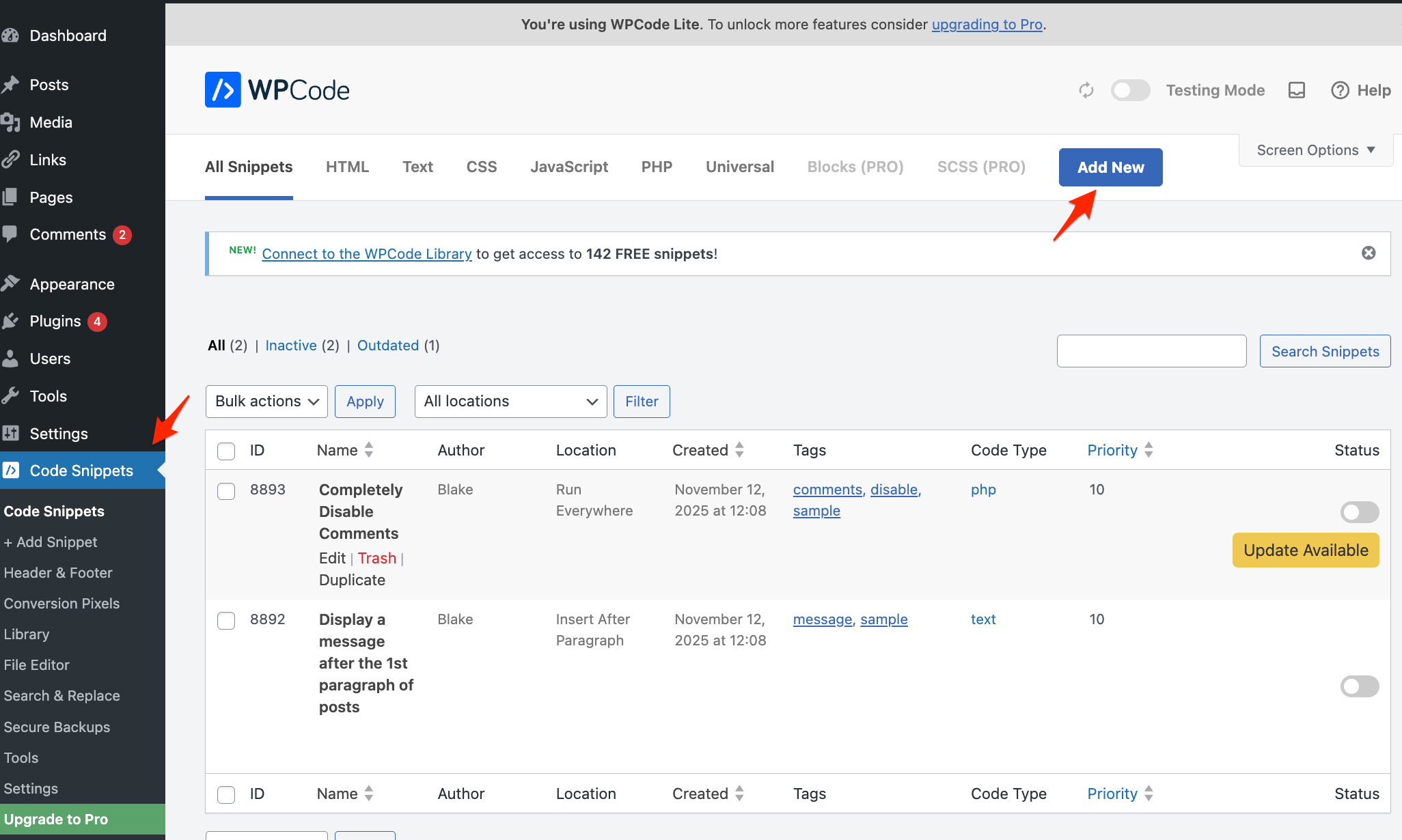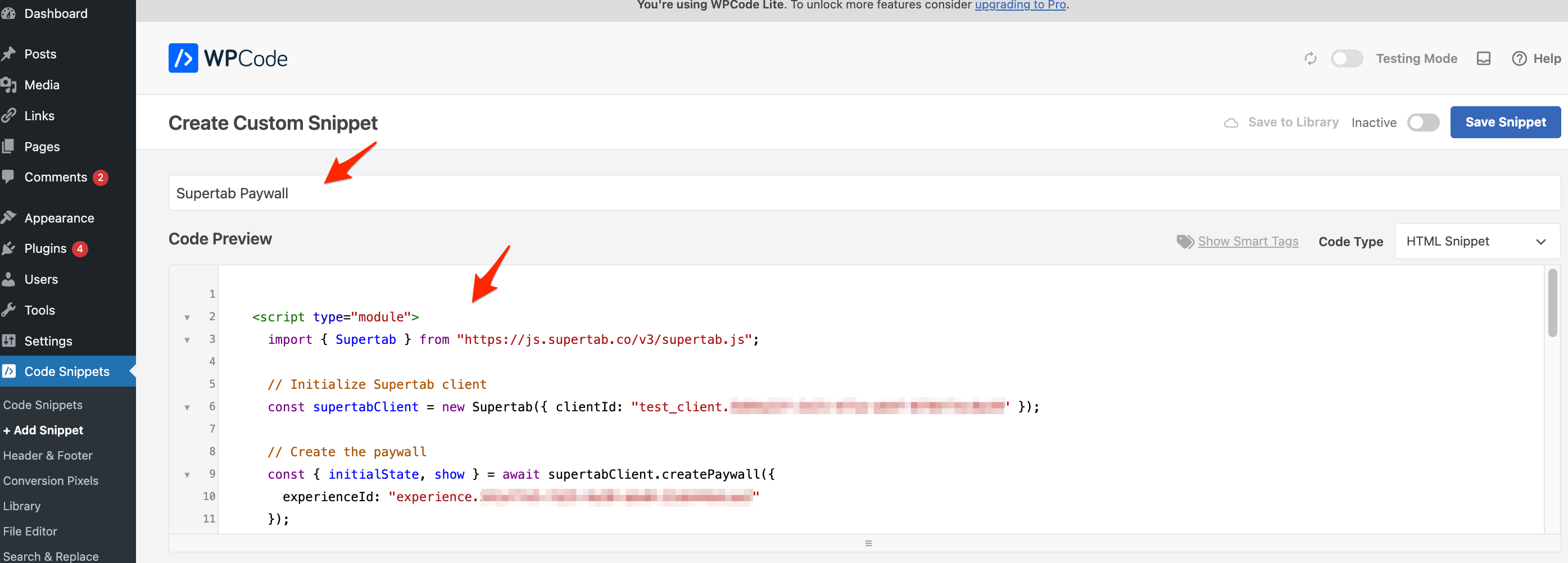 - Scroll back to the top and click "Save Snippet" or "Update".