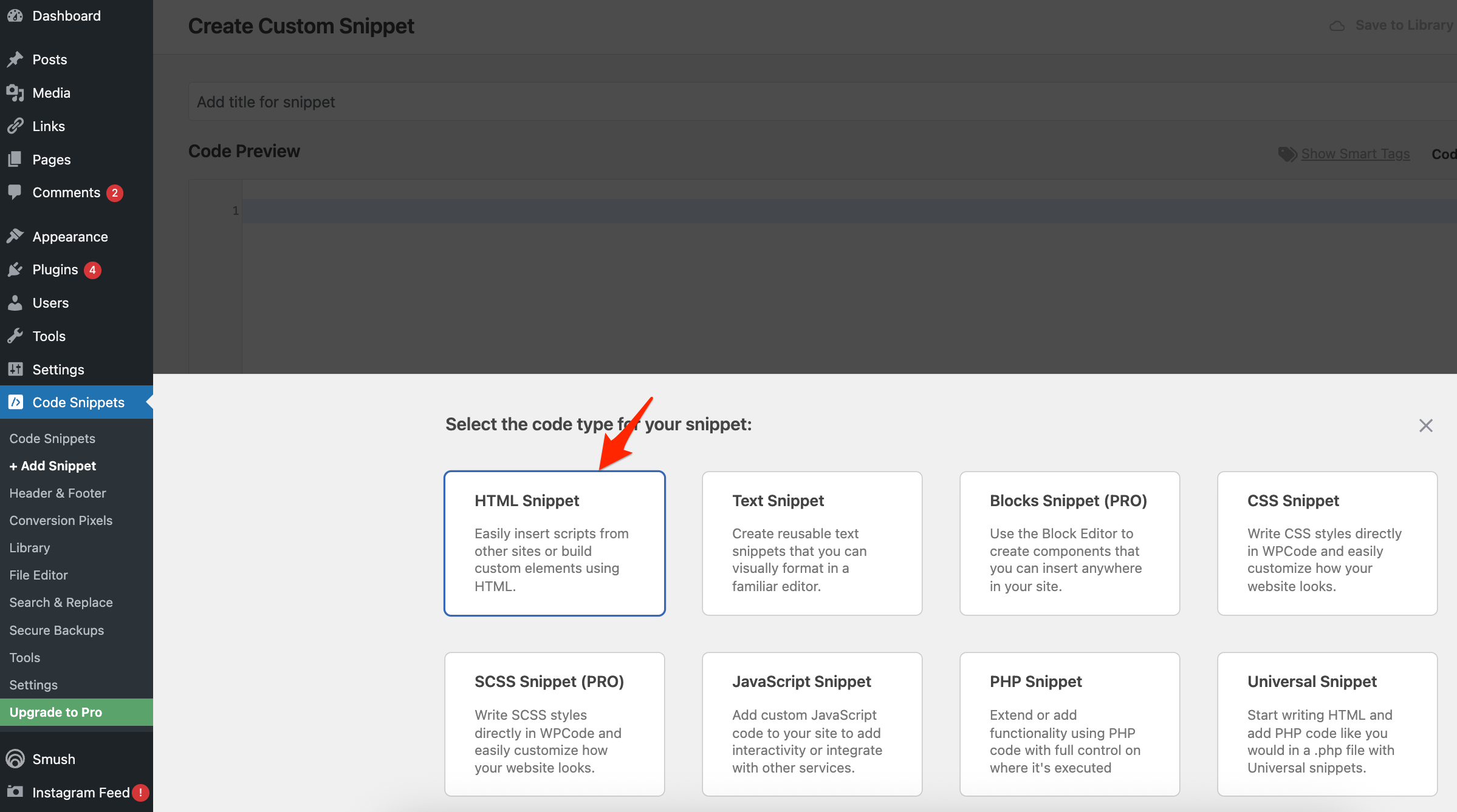 - Select "HTML Snippet". Note: Do not select JavasScript Snippet as it will not allow you to include the
