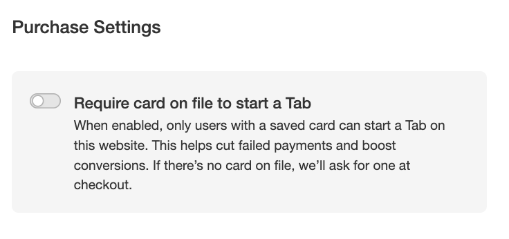 The Require Card on File option allows you to capture the users credit card before they can open a tab.
