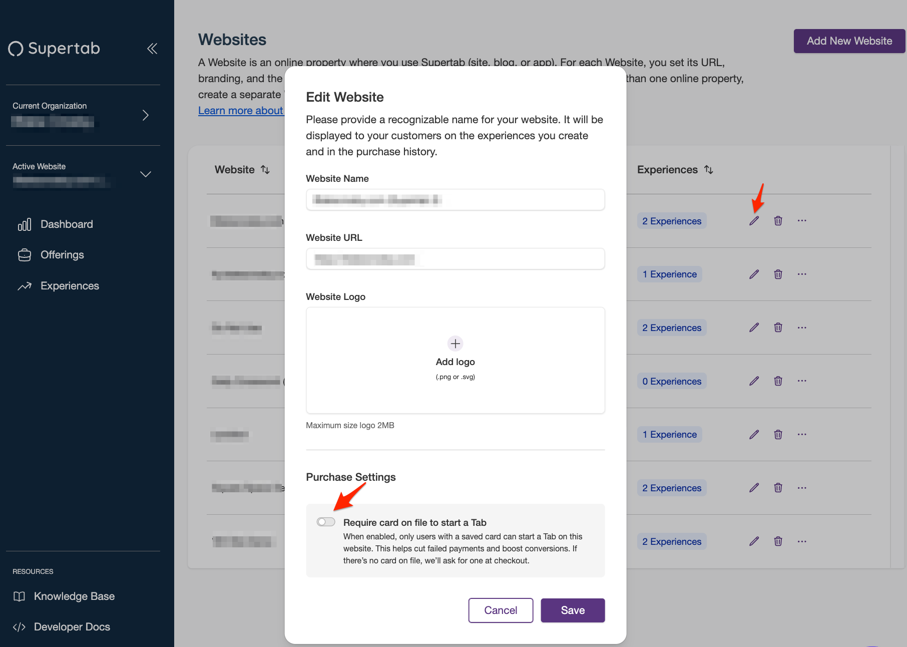 - Click on the "pencil" Icon next to the Website you would like to add "card on file" to.
